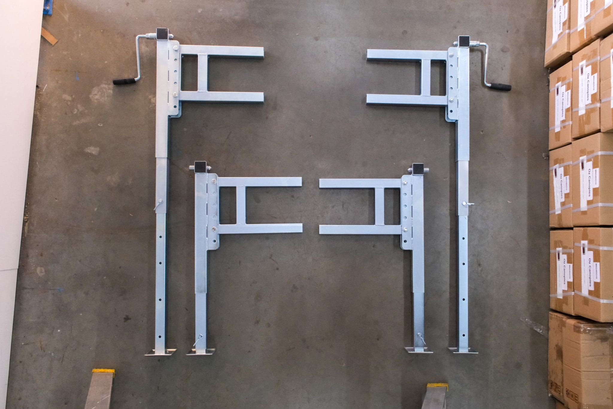 A must have for any Ute with a canopy fitted. These heavy duty Oz Canopies & 4×4 Canopy Jack off Legs are rated to hold up to 500kg of weight and will easily lift any Aluminium Ute Canopy we’ve come across. Featuring thick galvanised steel construction, fully welded and reinforced joints and an easy to use winding mechanism, these jack off leg kits are built to fit solidly in most industry standard Ute Canopies using 160mm spacing between canopy mounts.