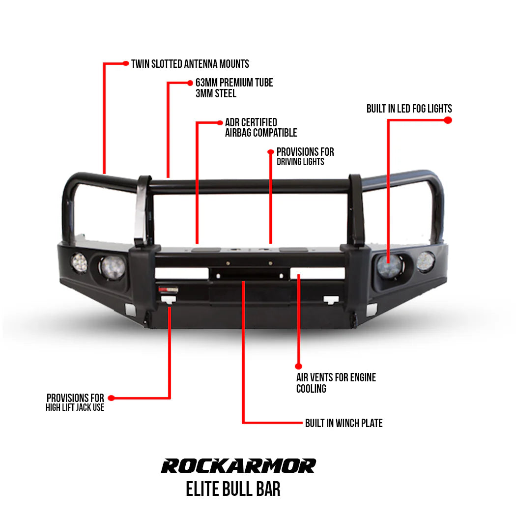 Designed & tested in Australia, Rockarmor’s Elite Steel Bull Bar was introduced back in 2015. Engineered to provide your vehicle with maximum frontal protection, each Rockarmor Elite Bull Bar has been uniquely designed to contour your vehicle’s exterior.